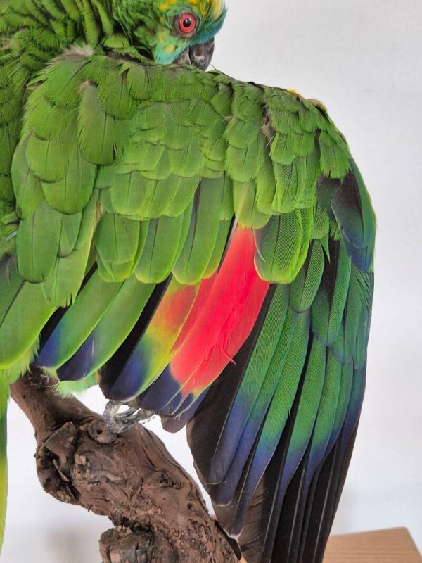 De openstaande vleugel laat mooi de blauwe en rode veren zien.