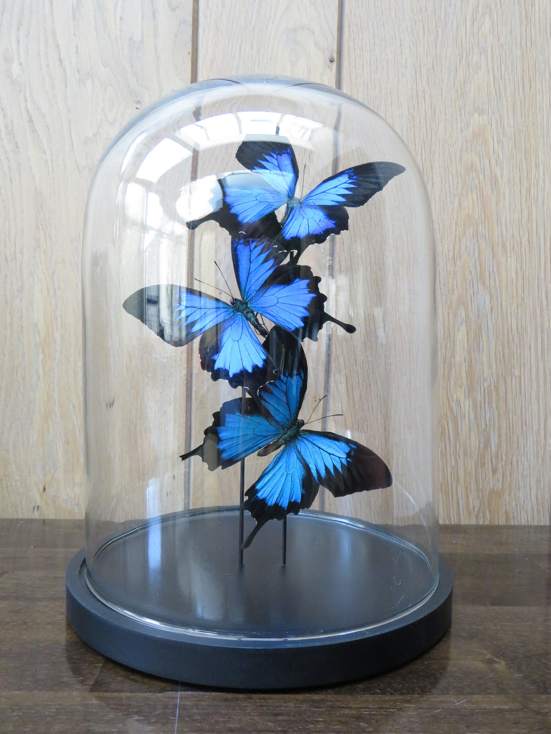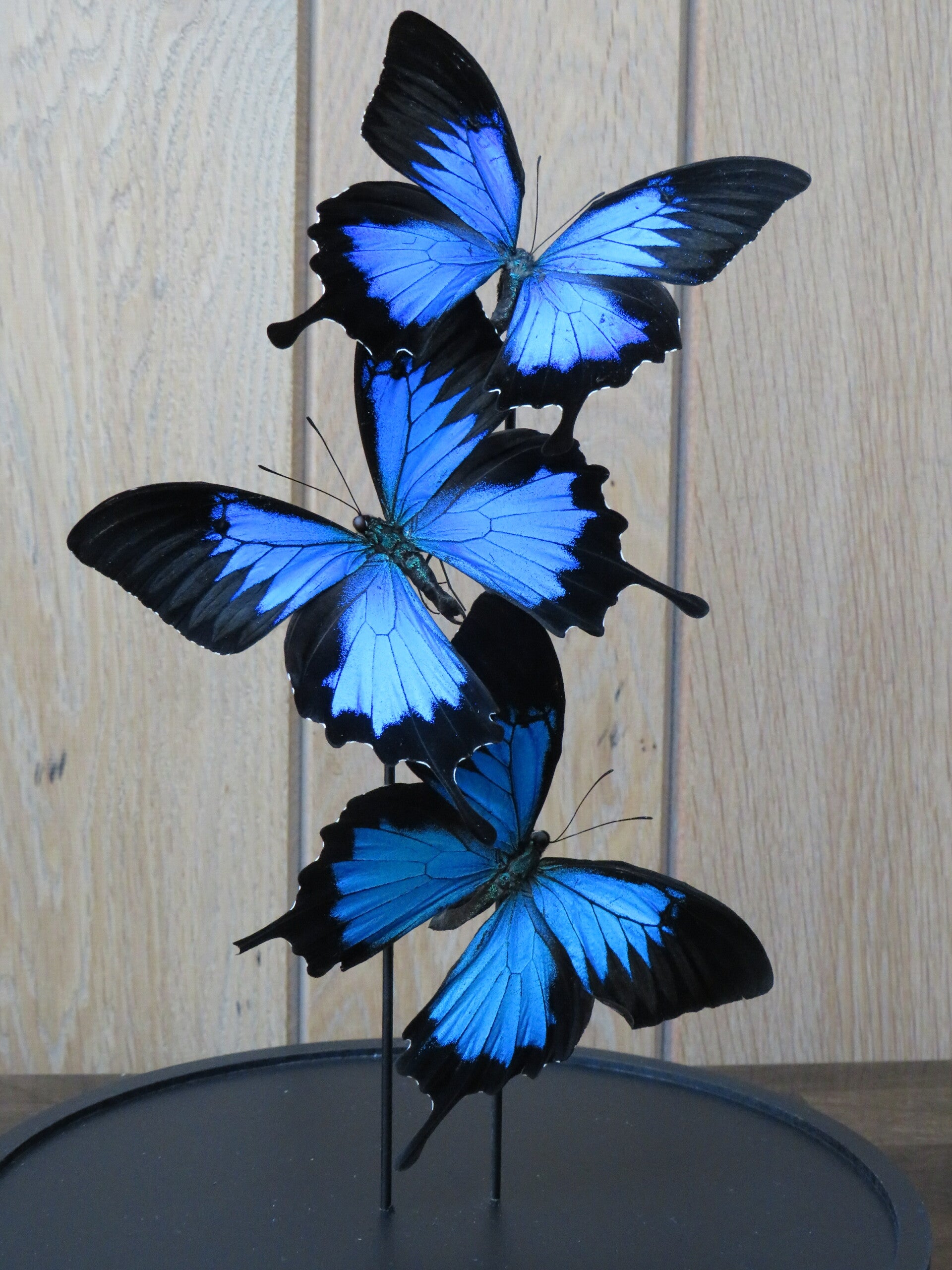 Glazen stolp met 3 echte Papilio ulysses uit Indonesië