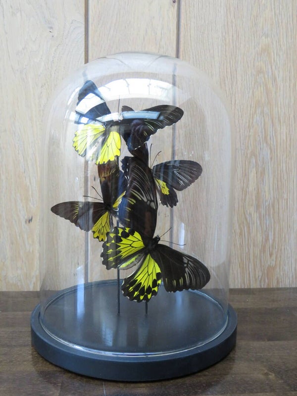 Glazen stolp met 4 echte vlinders in zwart en geel.