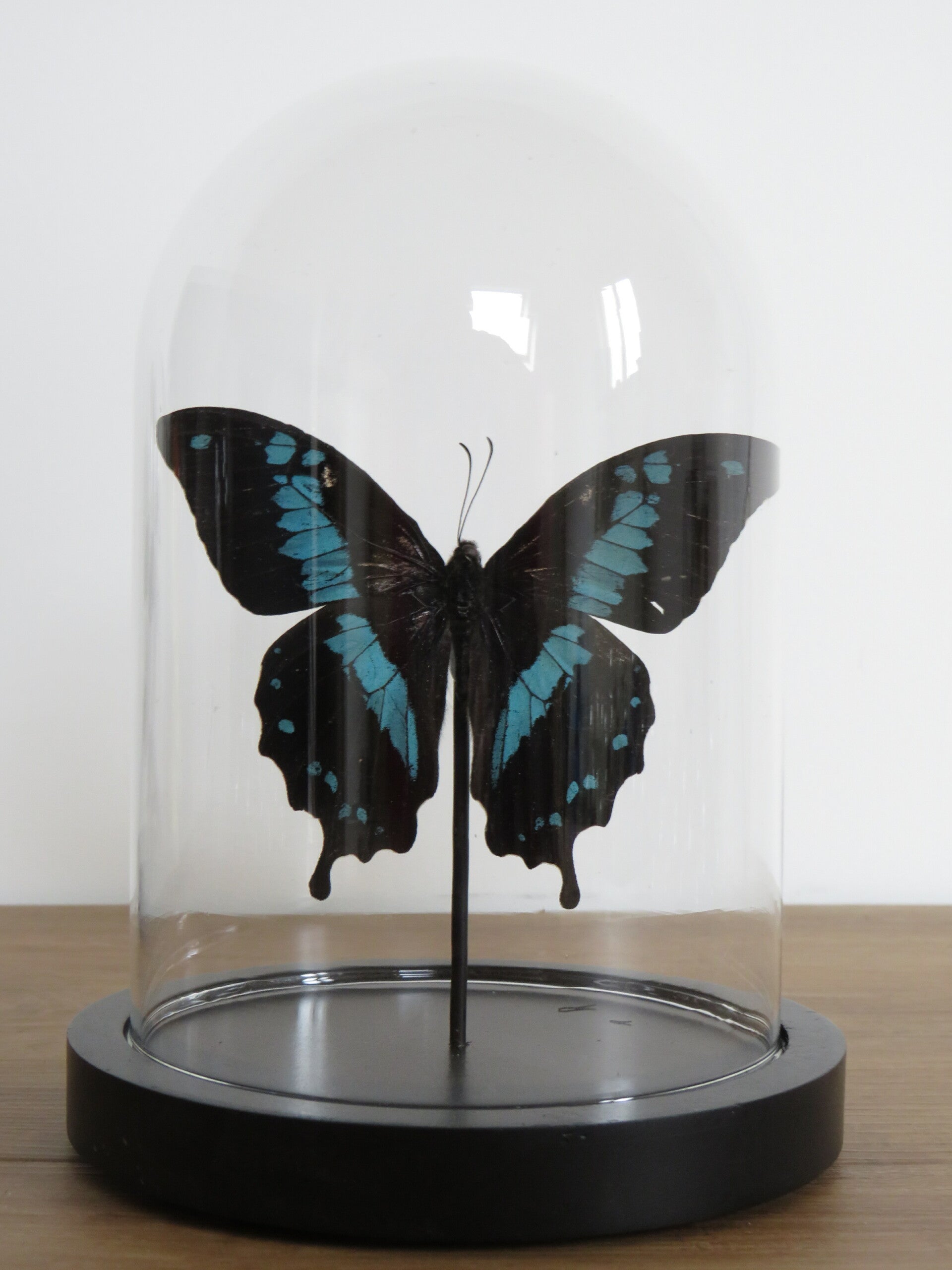 Wat : Glazen stolp op zwarte voet met 1 vlinder