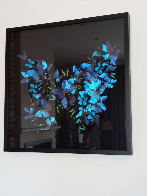 De kader meet 100 x 100 cm en er zijn veel vlinders verwerkt tot 1 grote.